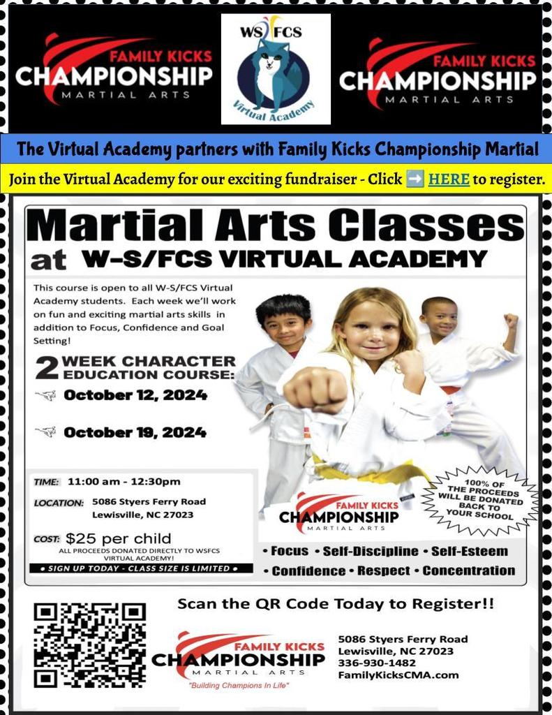 Parents, Guardians, & Learning Coaches, Please join us for another exciting fundraising opportunity with our students in which the Virtual Academy is partnering with Family Kicks Championship Martial Arts. They will be offering a 2 week Character Education Course.